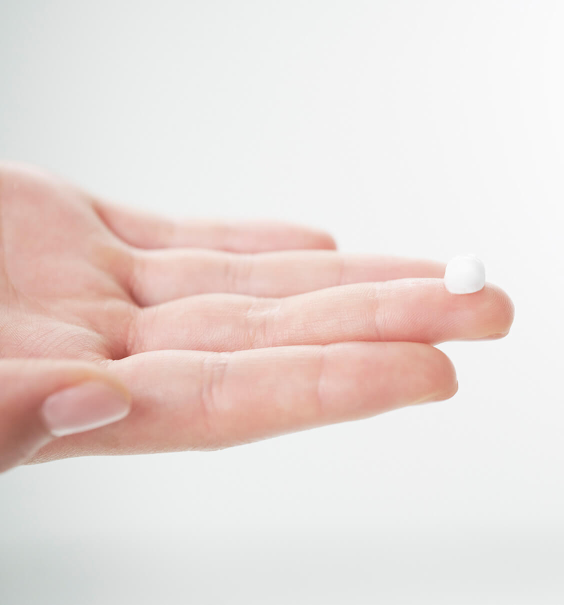 - 手のひらに使用量(パール粒1個分)をとり、両手のひら全体に広げます。